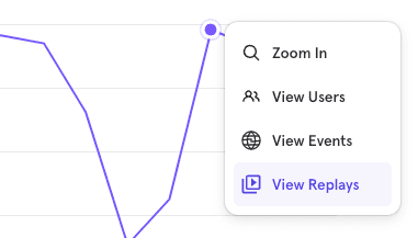 Click any point on a chart for Event, Funnel, and User Profile, and select ‘View Replays’ to view replays that show that event being fired. From here, you will be taken to our Replay Player.
